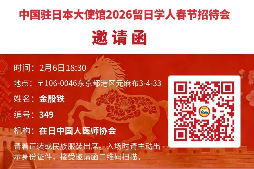 医師協会の銭勇会長、金殷鉄理事長、朱大勇副理事長兼事務局長、蔡偉華理事兼副事務局長、展広智理事が、中国駐日本大使館の招待を受け、大使館構内で開催された「2026年留日学人春節招待会」に出席しました。