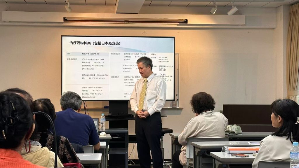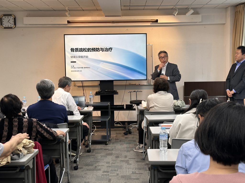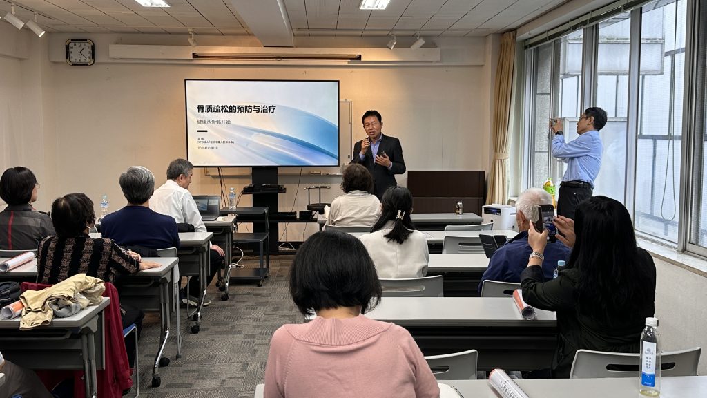 協会活動計画により、今年度第二回目の「中国帰国者&在日中国高齢者」向けの「健康講座」は10月11日に新橋国際善隣会館にて開催された。冒頭、銭勇会長がご挨拶後、呉明講師より「骨粗鬆症の予防及び治療」について講演を行った。その後、参加者からの質問に対して呉講師が専門家の立場で丁寧に分かりやすく対応した。雨の中、多くの高齢者方と協会の理事メンバーが出席し、円満に終了した。